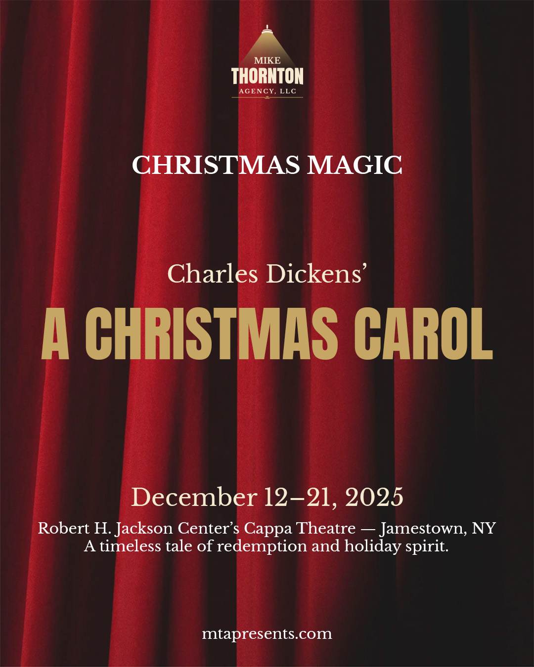 The Mike Thornton Agency LLC proudly presents a new, live theatrical production of Charles Dickens’s “A Christmas Carol”, running December 12–21 at the Robert H. Jackson Center’s Cappa Theatre in Jamestown, NY.